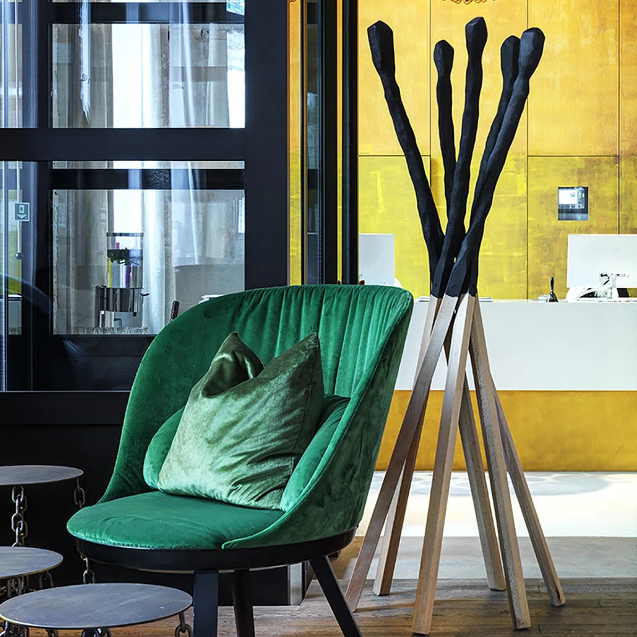 Both sculptural and functional, it brings a sense of movement and quiet irony to the room.