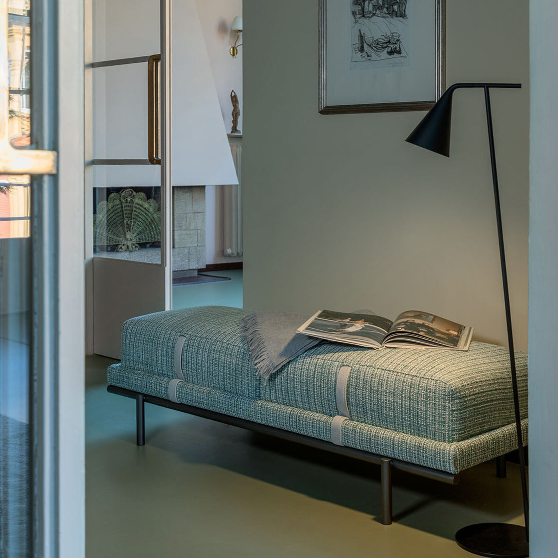 The name of this elegant double-size bed refers to the famous Bond Street in London. The headboard sports a detail that is original, distinctive. The New Bond double bed features a tasteful design that incorporates a striking combination of straps and eyelets on both the headboard and the surrounding panel.