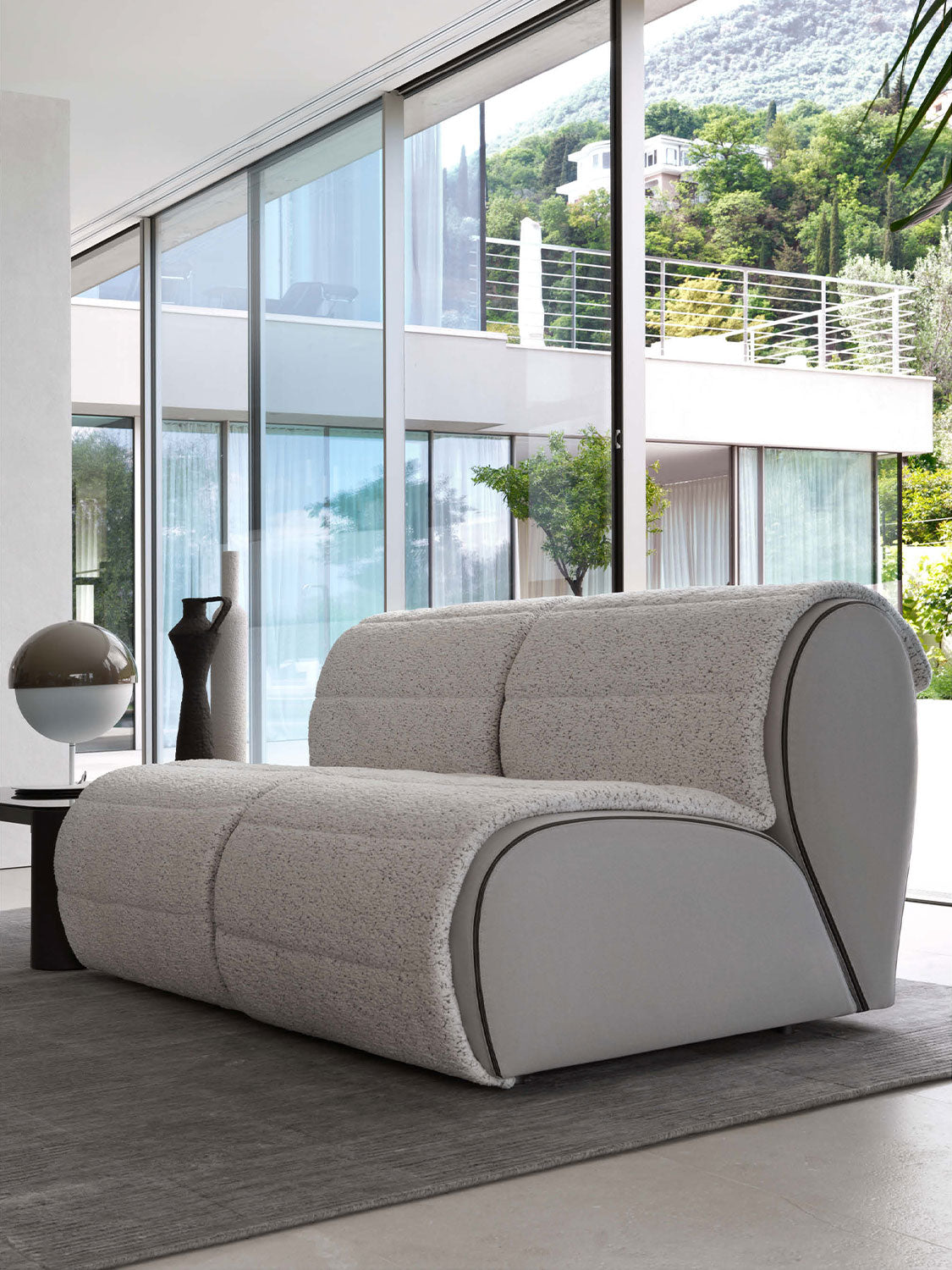Flora is an energetic seating unit that offers various solutions, which can be customised to fit changing needs. It is comprised of single or double seating units that can be merged to create unrestricted and infinite arrangements suitable for indoor and covered outdoor spaces. The unit is cushioned and comes with a removable fabric or leather cover that can be easily detached using black zips along the edges of the seat and backrest. Additionally, there is an optional detachable 'cloak' that can match the cover or have a contrasting colour. It is secured with Velcro in the central and lower parts of the seat and counterbalanced at the back of the backrest.
