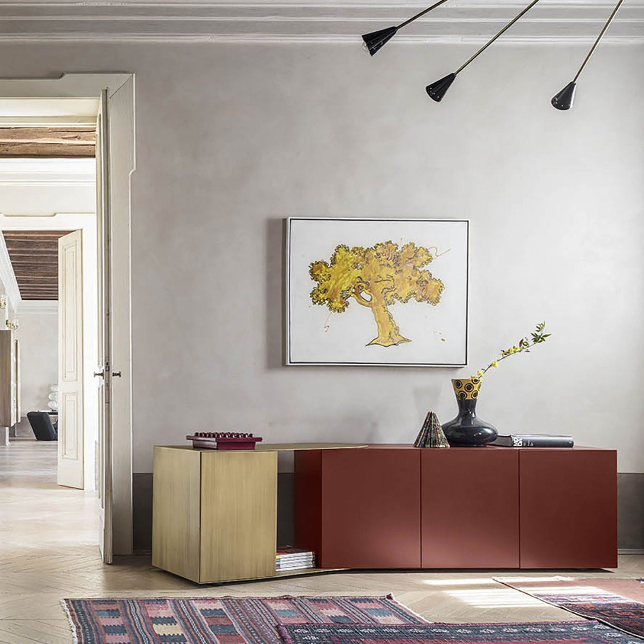 The Partout wall unit is a storage units with the structure in mdf plated with smoked Eucalyptus wood and adjustable metal element in patinated bronze. With a linear and geometric design with open and closed volumes, it can give rise to both rectilinear shapes and corner solutions. In fact, thanks to the adjustable metal element Partout can follow open and closed corners creating continuity on the walls. Available with left and right configuration