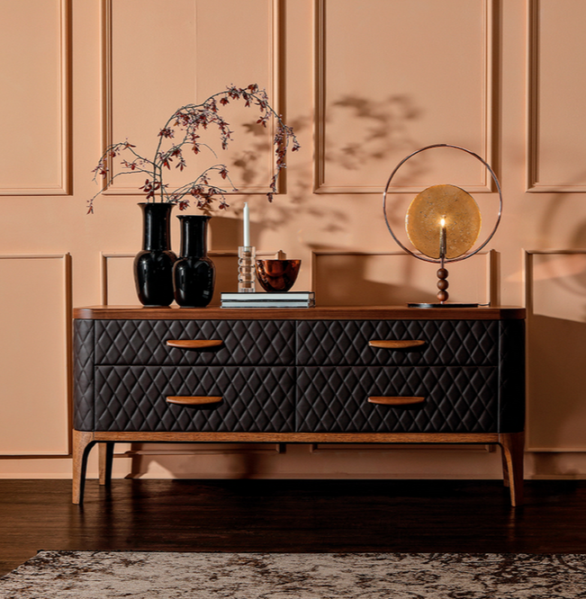 A luxurious sideboard that draws inspiration from the soft and delicate beauty of the ash tree. Available in Canaletto walnut, dark oak, or black ash finishing, this piece of furniture marries the elegance of wood with the sophistication of leather or eco-leather covering. The intricate, handmade quilting adds a touch of luxury and refinement to this sideboard.