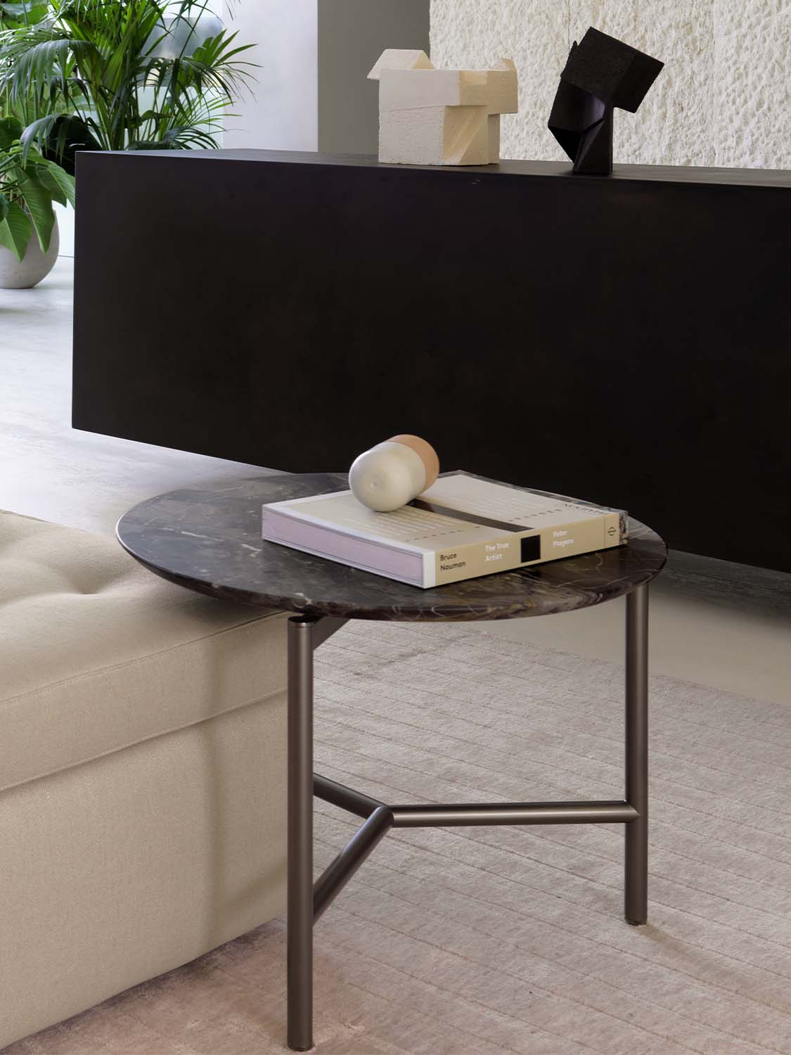 Dione coffee table A: top Ø 380 mm, base Ø 270 mm, H 500 mm Dione coffee table B: top Ø 900 mm, base Ø 440 mm, H 280 mm Dione coffee table C: top Ø 600 mm, base Ø 270 mm, H 400 mm