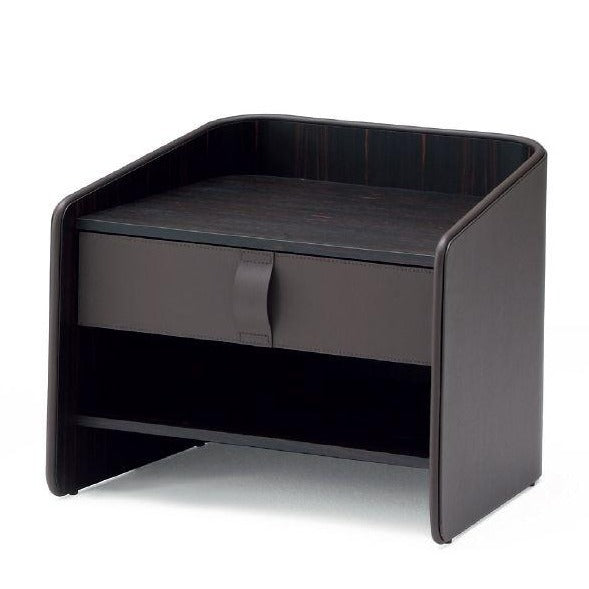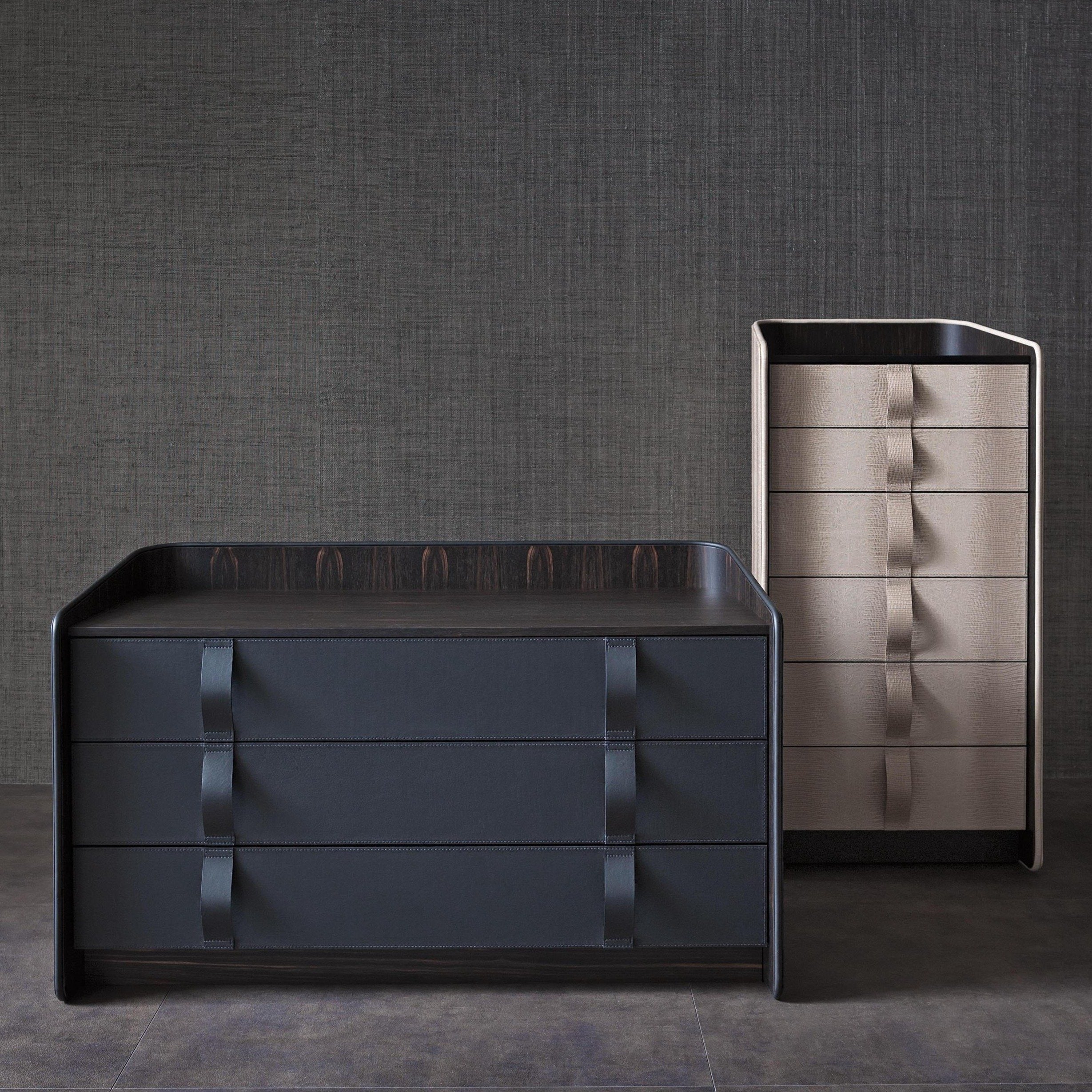 This cigar storage unit tells the story of new living aesthetics; it is the perfect accessory in areas devoted to relaxation and conviviality. The curved wooden structure has an external layer of leather, with tone-on-tone or contrasting leather piping; the interior surface is ebony with a matte finish. The top is also in ebony.