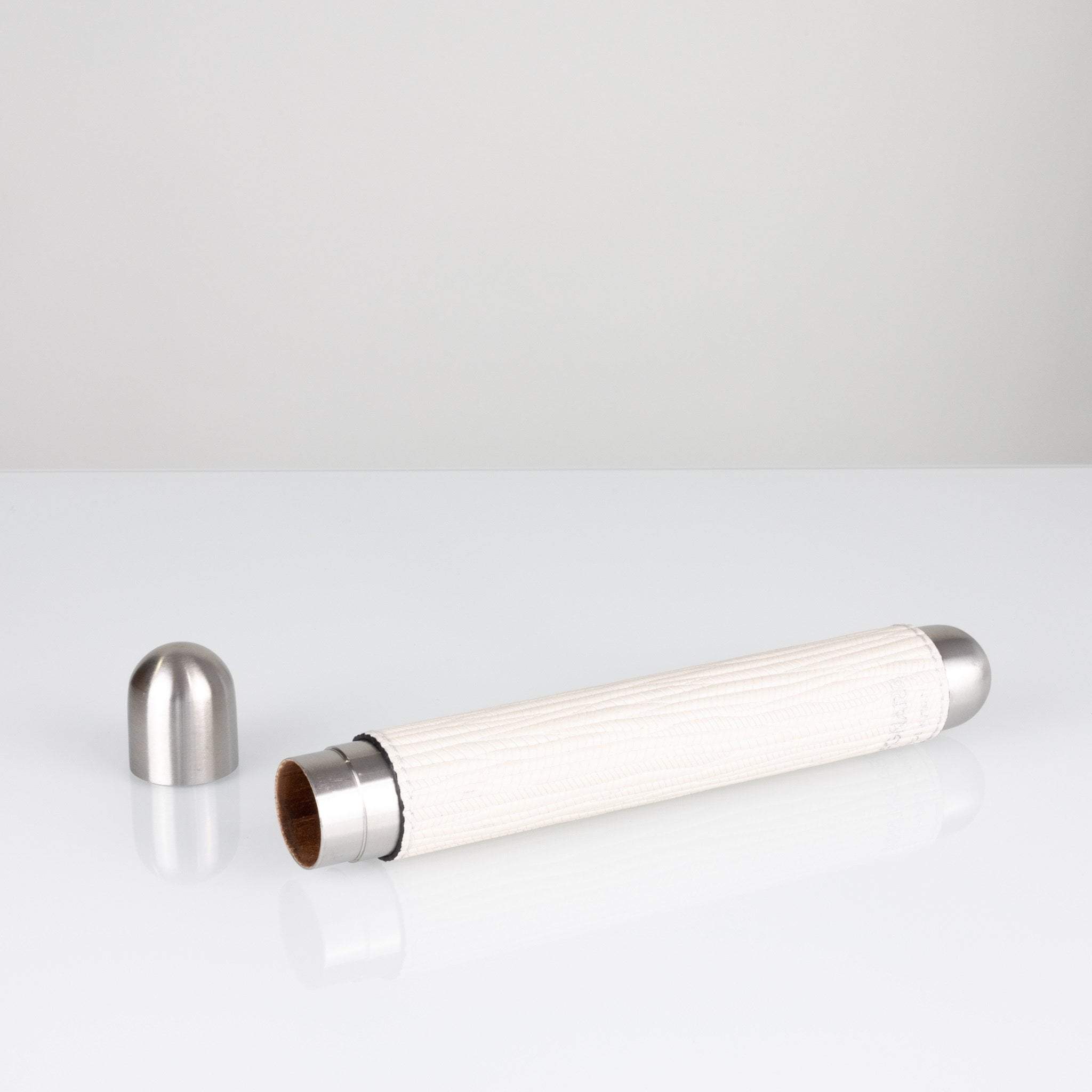 The upper compartment in Spanish cedar wood used for storing the cigars is illuminated by a battery-powered spotlight; the unit is also fitted with a temperature and humidity sensor to ensure the correct storage conditions. The upper portion is enclosed by a door in tempered glass with a frame in anodised aluminium; leather has been used to cover the cupboard doors of the lower portion and to create the handles.