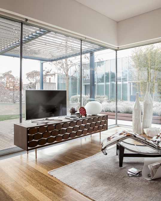 A system for your living-room, where spaces and lines have a fundamental role. A dresser, a night table and a drawer. The Honey Night Series is characterised by its distinguished woodwork. Canaletto walnut and dark heat-treated oak work together with the mirrors, to amplify the whole room.