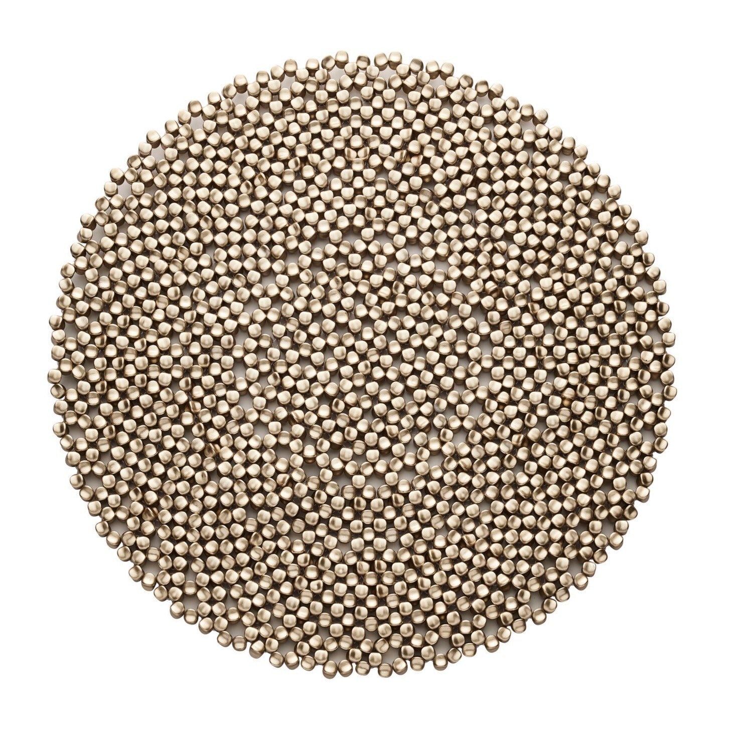 Fashioned after freezing ice, the intricate beading on the Frost Placemat mimics the crystalline form of icicles. The irregular border of the beaded Frost Placemat captures the translucent nature of ice. Assorted-sized bugle beads, sequins, glass beads, and gemstones elicit a festive upscale sensibility using a three-dimensional beading technique.