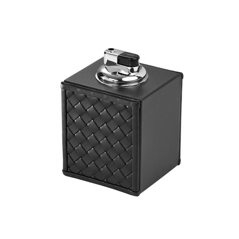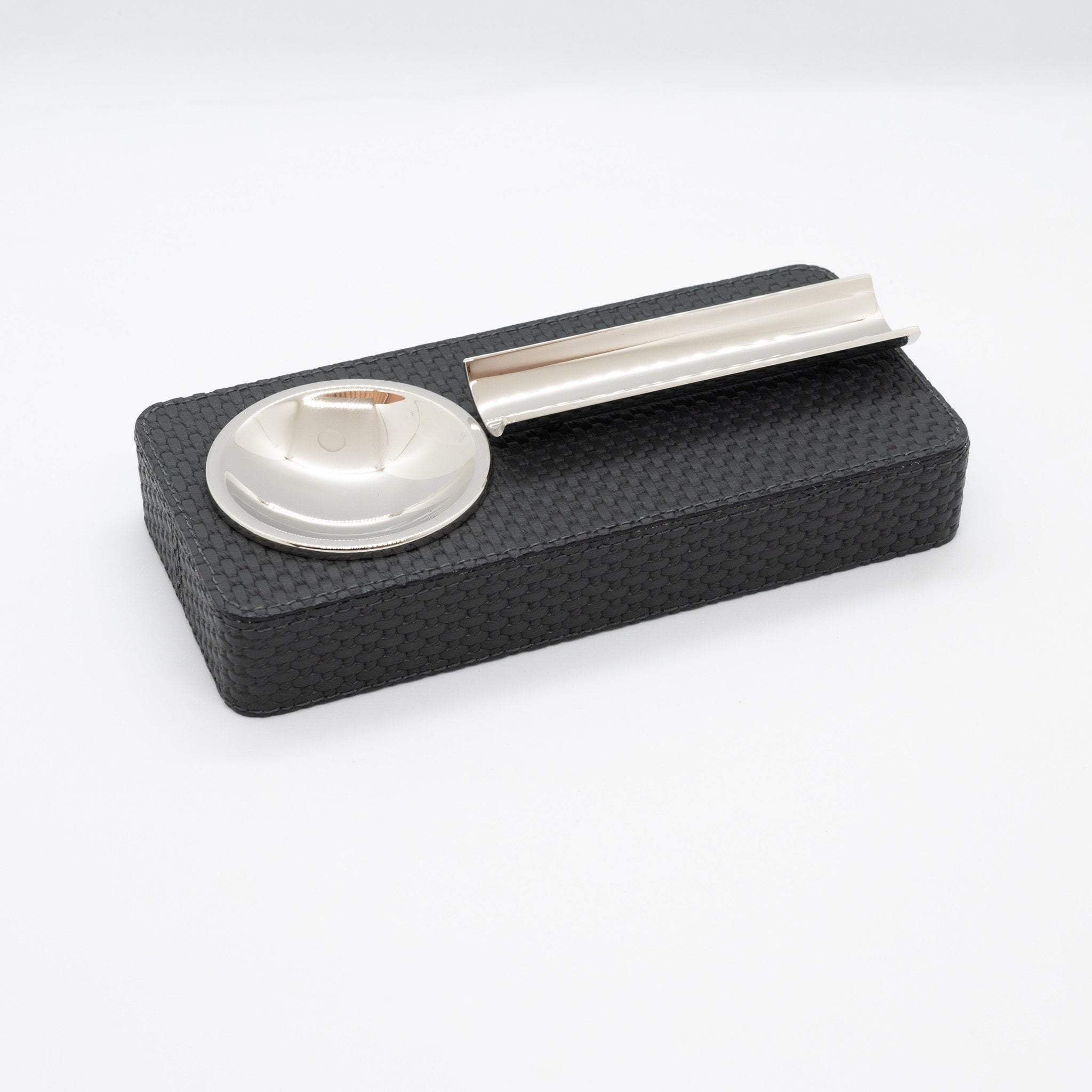 DESCRIPTION- Luxurious Cigar Ashtray with hand woven leather detail. Pair with table lighter to complete the experience.