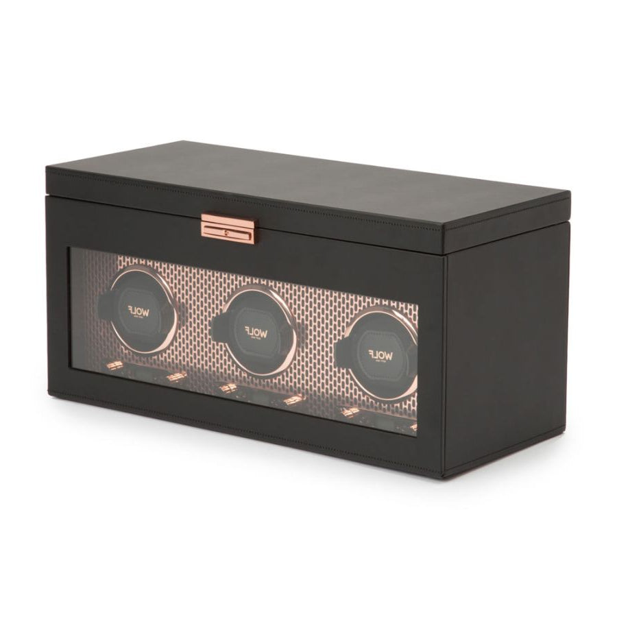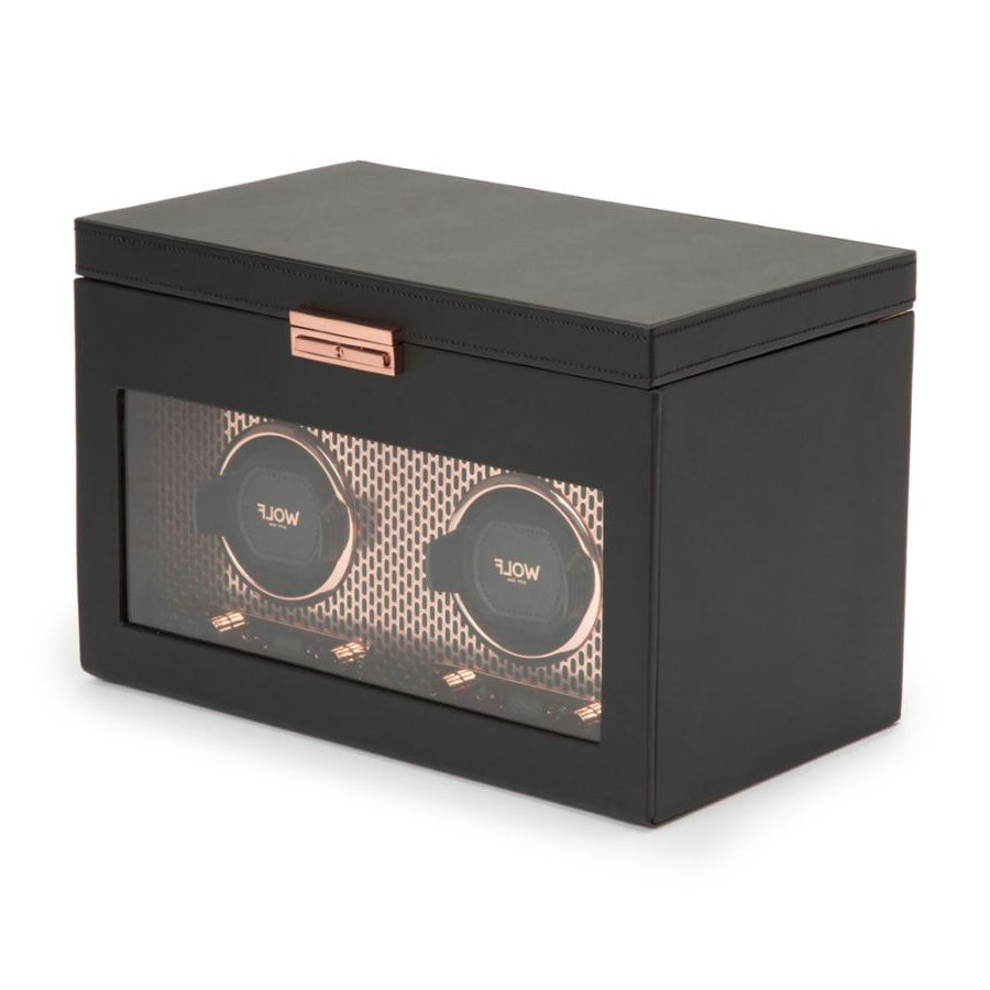 Copper plated laser cut perforated steel melded with clean, sleek lines. AXIS drives a modern, bold look for safekeeping your timepieces. Our patented technology of counting rotations of the axis of your watch guarantees precise turns per day. Bold luxury, faultless design, take AXIS for a spin. Features locking glass cover, backlit LCD display, copper finished hardware, and a single winding module with storage.