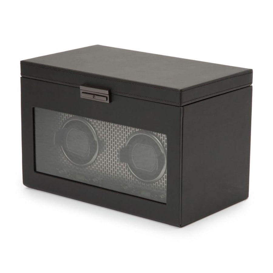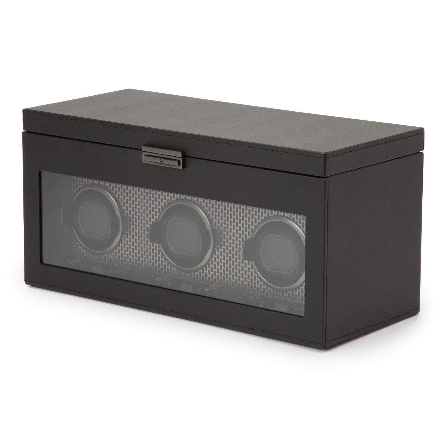 Powder-coated laser cut perforated steel melded with clean, sleek lines. AXIS drives a modern, bold look for safekeeping your timepieces. Trusted patented technology of counting rotations of the axis of your watch guarantees precise turns per day. Bold luxury, faultless design, take AXIS for a spin. Features locking glass cover, backlit LCD display, powder coated hardware and a single winding module with storage.