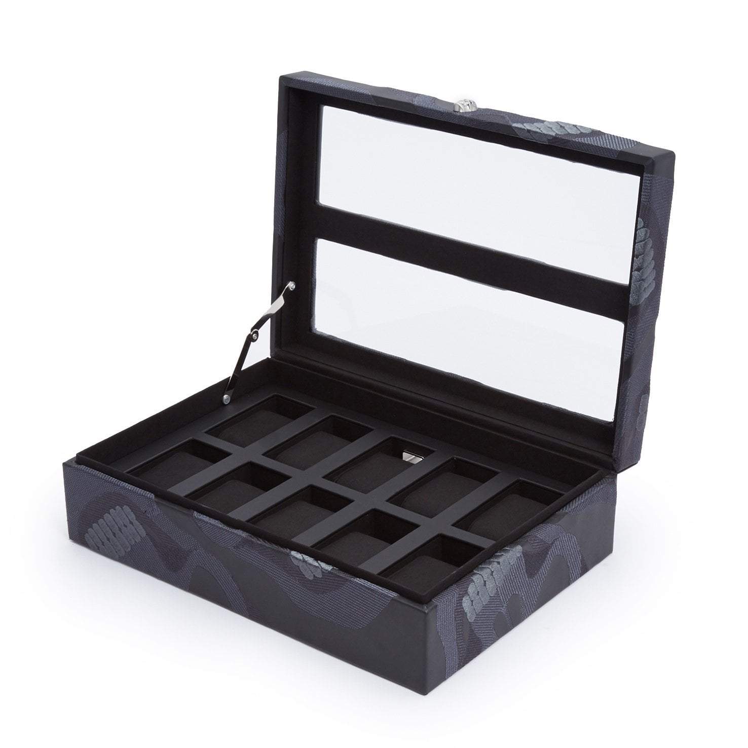 Includes brushed chrome skull hardware, glass cover, skull embroidered leather, and 10-piece watch storage.